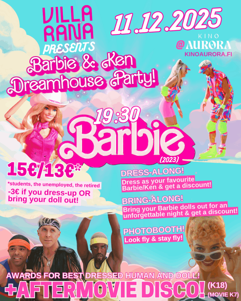 Kino Auroran syyskauden päättäjäisbileinä torstaina 11.12.2025 Kulttuuritalo Villa Rana & Ravintola Villa Rana muuttuu yhdeksi illaksi utopistisen ihanaksi Unelmataloksi, jossa Barbiet ja Kenit (ja Allanit) saavat viettää fantasistista aikaa leffan & bileiden parissa! 🍿💞